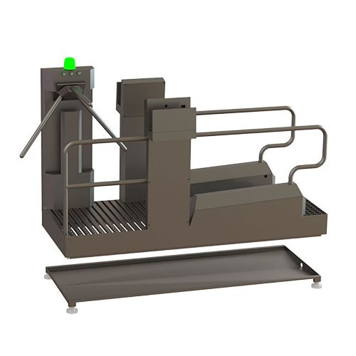 Esse equipamento une duas funções cruciais: higienização do calçado e controle de acesso. A catraca só libera a passagem do colaborador após a finalização do ciclo de limpeza, assegurando que nenhuma etapa seja negligenciada. Trata-se de uma solução eficiente para disciplinar fluxos de entrada, garantindo que o protocolo sanitário seja seguido rigorosamente antes do acesso às áreas de produção.