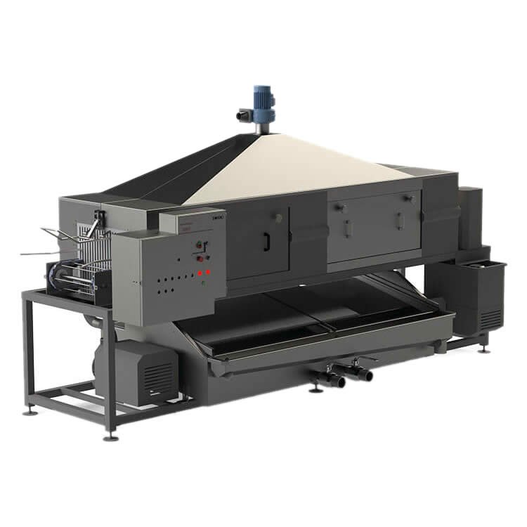 O diferencial está no fluxo de água de baixo para cima, com jatos internos que promovem turbilhonamento, resultando em uma escaldagem uniforme com melhor rendimento mesmo em temperaturas mais baixas. A máquina conta ainda com um sistema de autolimpeza a vapor, otimizando o tempo de parada e facilitando a higienização – essencial para atender às exigências do Ministério da Agricultura.
