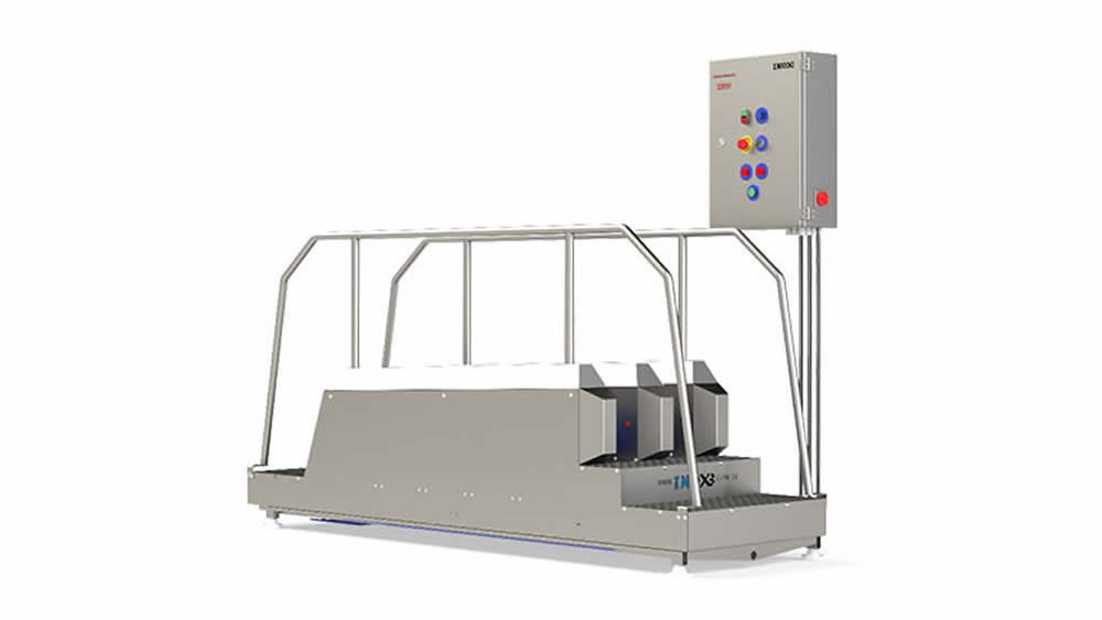 Ideais para plantas com alto volume de colaboradores. Aqui, o funcionário caminha pelo equipamento enquanto as escovas rotativas e o sanitizante fazem o trabalho.